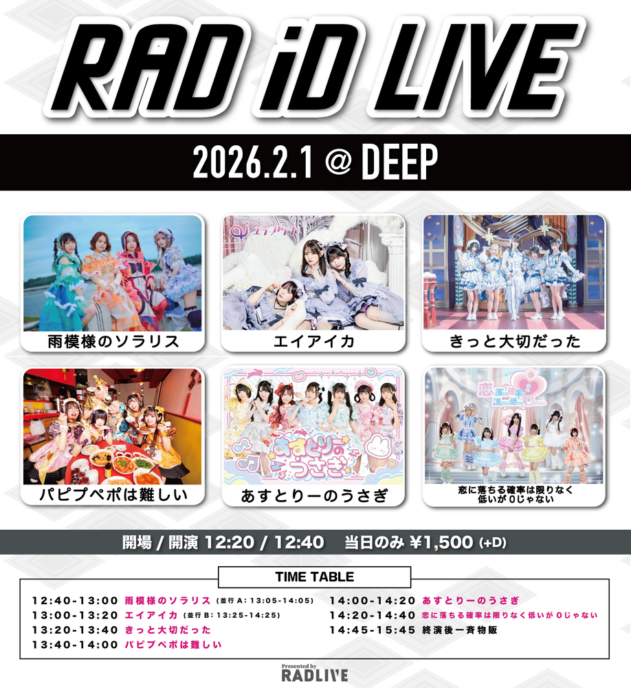RAD iD LIVE SCHEDULE 2026/02/01(日) 12:20 - DEEP(名古屋) RAD iD LIVE 日程:2026年02月01日(日) 会場:DEEP(名古屋) 時間:OPEN 12:20 / START 12:40 チケット:(+1D) 当日券¥1,500-※当日券のみのご案内となります 出演者: 雨模様のソラリス エイアイカ きっと大切だった パピプペポは難しい あすとりーのうさぎ 恋に落ちる確率は限りなく低いが0じゃない URLをコピーする 報告する
